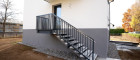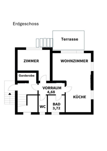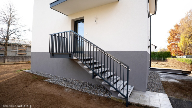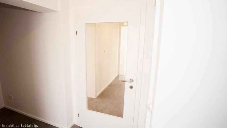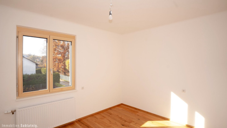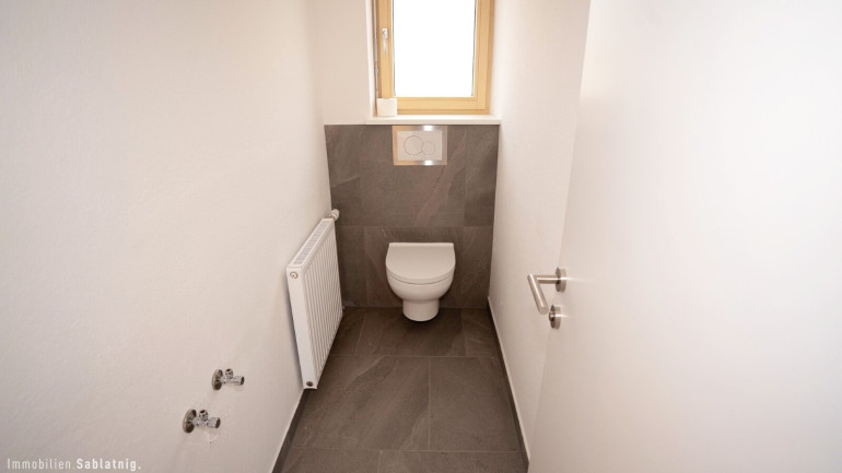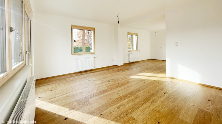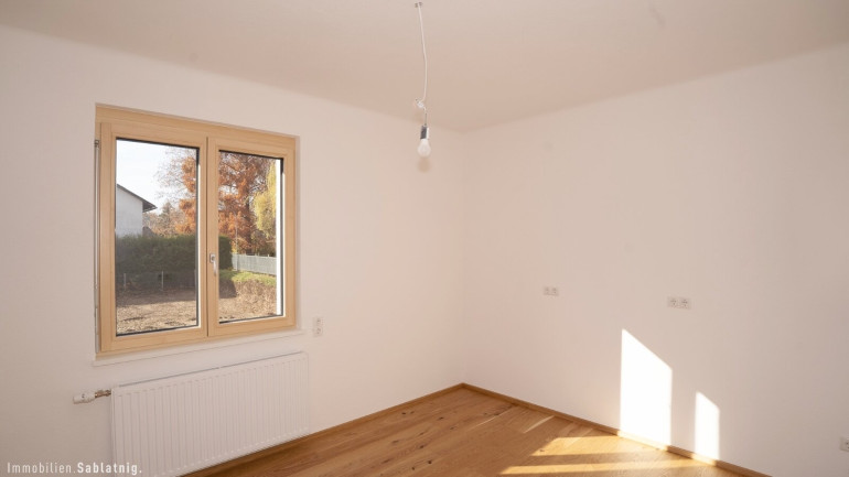 Der überdachte Eingangsbereich führt in das Erdgeschoss mit einem einladenden, großzügigen Garderobenraum. Von hier aus öffnet sich ein heller Gang in den Wohnbereich, der in den weitläufigen, lichtdurchfluteten Wohn-Essbereich mit Zugang zur Terrasse und zum Garten führt. Ein weiteres helles Zimmer sowie ein geräumiges Badezimmer mit Dusche befinden sich ebenfalls auf dieser Ebene. Ein Gäste-WC ergänzt das Raumangebot.