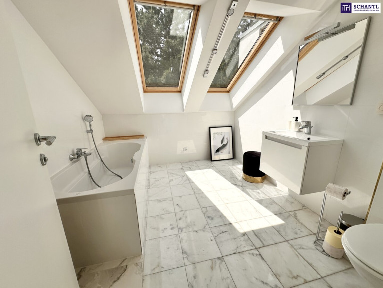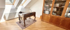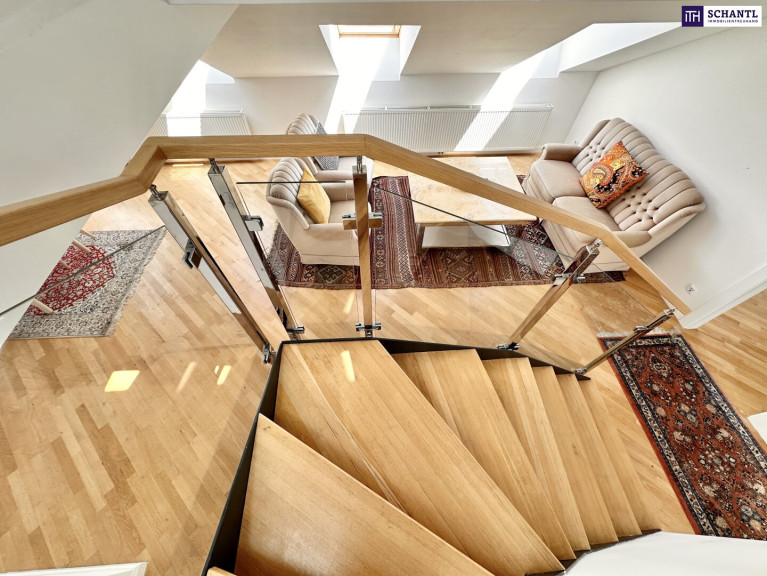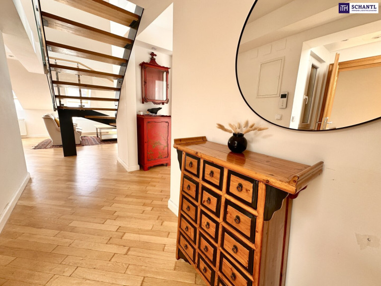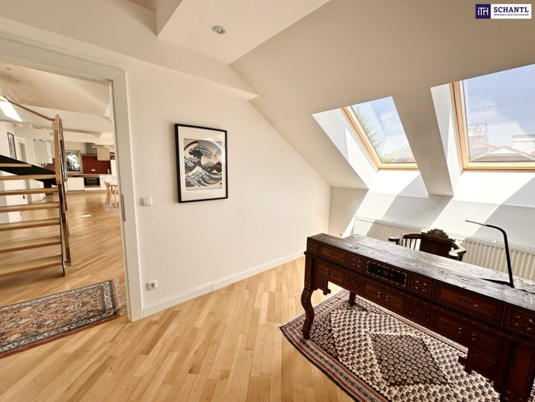 Das Dachgeschoss verfügt bereits über einen direkten Liftzugang sowie einen Zugang über das Stiegenhaus; ein weiterer separater Zugang über das bestehende Stiegenhaus ließe sich bei Bedarf unkompliziert realisieren –– eine architektonisch elegante Möglichkeit, die Einheit bei Bedarf in zwei separate Wohnungen zu teilen