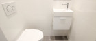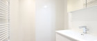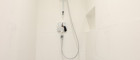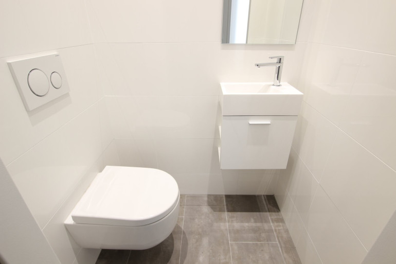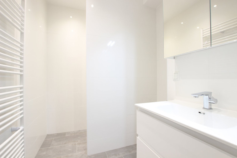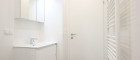 Das Badezimmer ist mit einer modernen Walk-In Dusche mit Edelstahl-Abflussrinne, Handtuchheizkörper und Waschmaschinenanschluss ausgestattet. Außerdem sorgt ein attraktiver Waschtisch und Spiegelschrank für Styling im Badezimmer. Viel Stauraum bietet ein praktischer Abstellraum.
