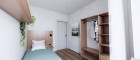 Die Grundrisslösung des Apartments legt Wert auf Funktionalität, ausreichend Tageslicht und eine fließende Verbindung des Innenraums mit dem Außenbereich durch eine großzügige Terrasse. Der Eingangsbereich besteht aus einem Vorraum, von dem aus man in den Wohnraum mit Küchenbereich und direktem Ausgang zur Terrasse gelangt. An den Wohnbereich schließen sich zwei Zimmer und ein Badezimmer mit WC an.