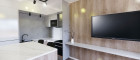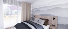 Der Grundriss des Apartments legt den Fokus auf Funktionalität, viel Tageslicht und eine fließende Verbindung zwischen Innen- und Außenbereich durch eine großzügige Terrasse. Der Eingangsbereich führt in den Wohnraum mit Küchenzeile und direktem Zugang zur Terrasse. An den Wohnbereich schließen ein separates Schlafzimmer sowie ein Badezimmer mit WC an. Die Ausrichtung des Apartments ist auf die optimale Nutzung von Ausblicken und die ruhige Atmosphäre der Umgebung abgestimmt.