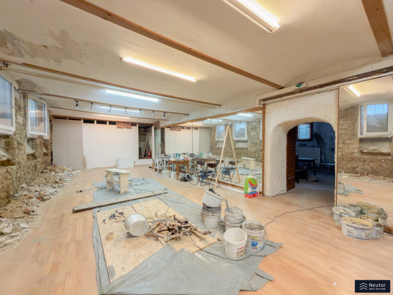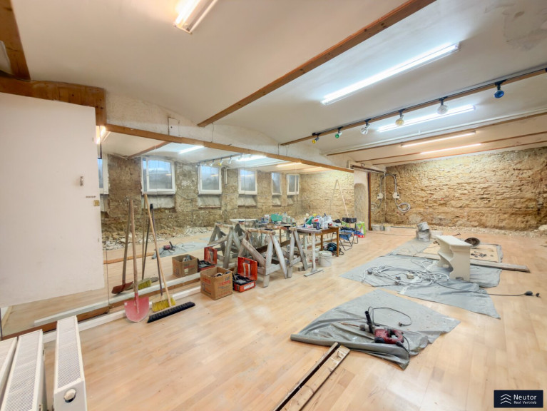Dieses charmante Souterrain-Studio überzeugt durch seine optimale Raumaufteilung und vielseitige Nutzungsmöglichkeiten. Über den Eingang gelangen Sie in einen großzügigen Vorraum, der zugleich als stilvoller Empfangsbereich dient. Eine praktische Teeküche ist integriert und erhöht die Funktionalität des Raumes erheblich. Ein Kamin im Vorraum sorgt für eine behagliche Atmosphäre und verleiht dem Studio einen besonderen Charakter. Vom Vorraum aus gelangt man in den Hauptraum, der durch seine Großzügigkeit und Flexibilität besticht. Er eignet sich ideal für unterschiedliche gewerbliche Nutzungen, wie etwa Ateliers, Studios oder kreative Arbeitskonzepte. Gegenüber der Eingangstür befinden sich die Nebenräume, die den Komfort des Studios zusätzlich unterstreichen: zwei Garderoben, zwei WC-Anlagen und Duschen, optimal ausgestattet für Mitarbeiter und Kunden. Die Kombination aus funktionalen Arbeitsbereichen, einem einladenden Empfangsbereich und gut ausgestatteten sanitären Einrichtungen macht dieses Studio zu einer idealen Lösung für alle, die Wert auf eine hochwertige und zugleich flexible Arbeitsumgebung legen.