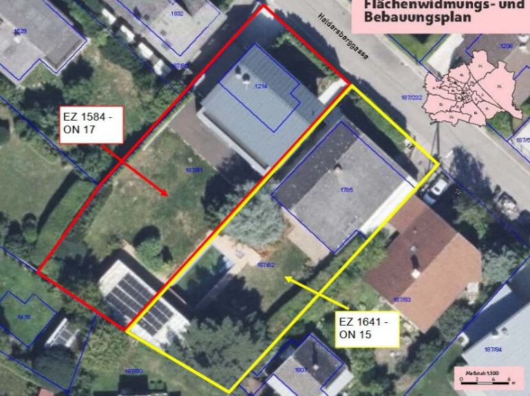Die beiden Grundstücke ergeben zusammen eine außergewöhnliche Fläche von ca. 1.244 m² in einem ruhigen Einfamilienhausgebiet nahe dem Naherholungsgebiet Baumgartner Wald / Schottenwald.