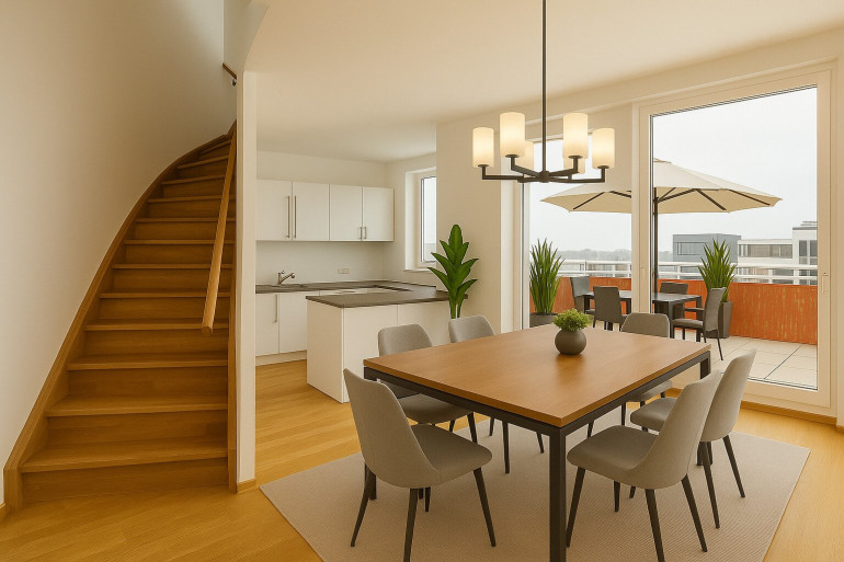 Die Wohnung ist mit hochwertigen Materialien ausgestattet, darunter elegante Fliesen und warmes Parkett die ein harmonisches Wohnambiente schaffen. Die moderne Einbauküche ist nicht nur funktional, sondern auch ein echter Hingucker – perfekt für Ihre individuellen Kochkünste. Die Fußbodenheizung sorgt zudem für wohlige Wärme an kalten Tagen. Zum oberen Stockwerk führt eine Holztreppe.