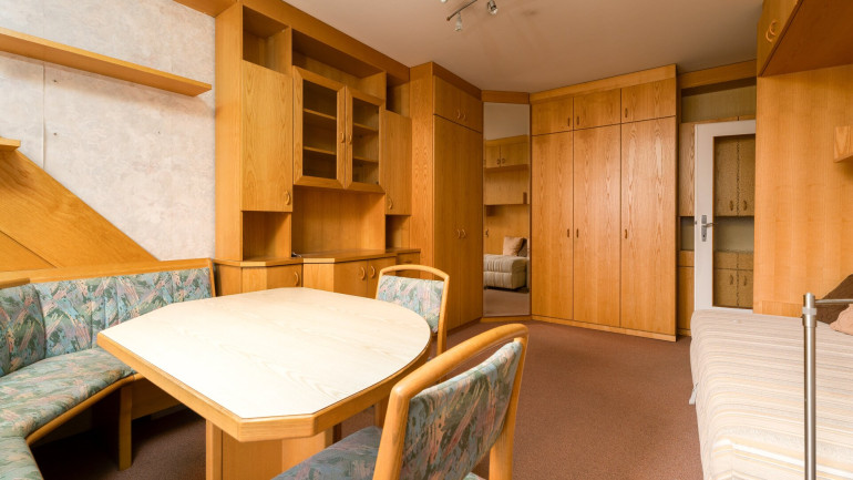 Über das Stiegenhaus oder mit dem Lift gelangen Sie in den 1. Stock. Im Vorzimmer stehend befindet sich geradeaus das Badezimmer ausgestattet mit Dusche, WC, Handwaschbecken und Waschmaschinenanschluss. Auf der rechten Seite steht Ihnen der Wohn- u. Schlafbereich inkl. Essecke zur Verfügung. Von hier aus gelangen Sie geradeaus auf die Loggia und linkerhand in die Küche.