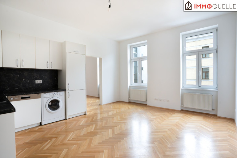Vom Vorraum aus öffnet sich die Wohnküche, die das Herzstück der Wohnung bildet. Die südliche Ausrichtung sorgt für viel Tageslicht und ein freundliches Raumgefühl. Hier verbinden sich Kochen, Essen und Wohnen in einem offenen, gut proportionierten Bereich. Die klare Raumform bietet ausreichend Platz für eine Küchenzeile, einen Esstisch sowie einen gemütlichen Wohnbereich - offen, hell und einladend.