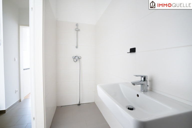 Bereits beim Betreten zeigt sich die angenehme Klarheit des Grundrisses. Der Vorraum ist kompakt und funktional gestaltet. Auf der rechten Seite befindet sich das Badezimmer, ausgestattet mit Dusche, Waschbecken, WC und Heizkörper - übersichtlich geplant und praktisch im täglichen Gebrauch.
