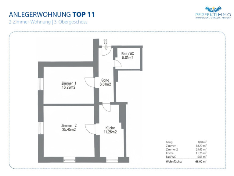 Top 11 liegt ebenfalls im dritten Obergeschoß, jedoch straßenseitig mit Südwest-Ausrichtung, und weist eine Wohnfläche von 68,02 m² auf. Die Einheit besteht aus Gang, Bad/WC, Küche sowie zwei Zimmern. Zugeordnet ist ein besonders großzügiges Kellerabteil mit einer Nutzfläche von 19,75 m².