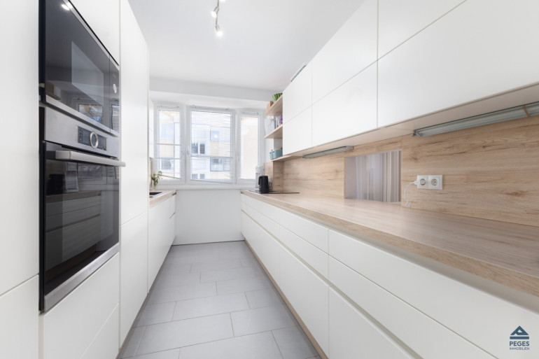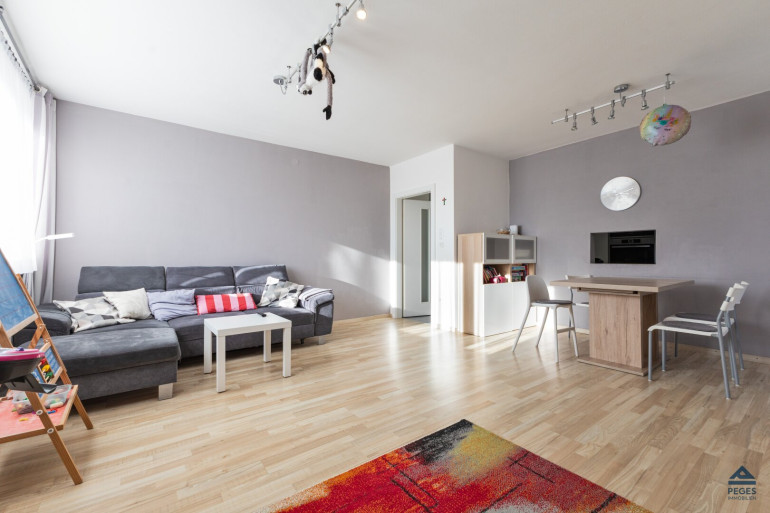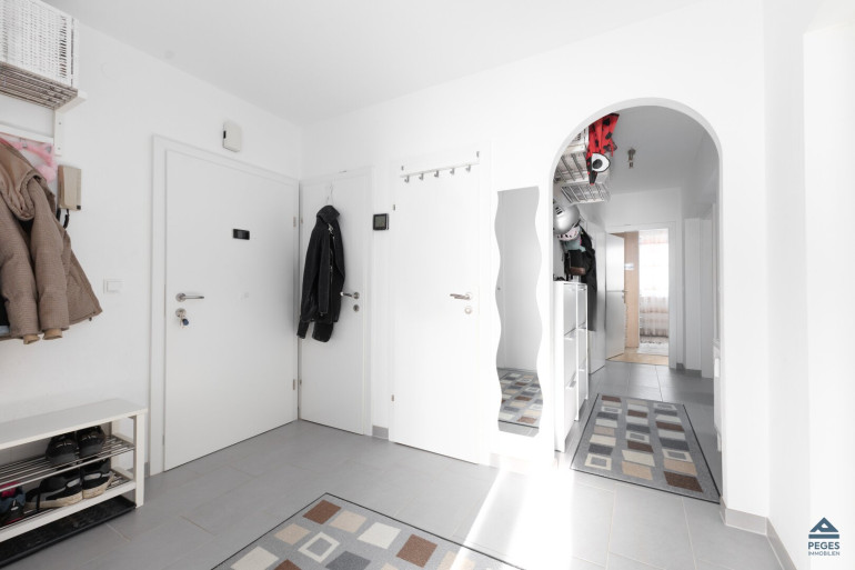 Vom freundlich-hellen Vorraum gelangt man in alle weiteren Räumlichkeiten (-zentral begehbar). Das großzügig, lichtdurchflutete Wohn-/Esszimmer ist mit großen Fensterelementen versehen. Eine kleine Durchreiche verbindet zudem die separate Küche, eingerichtet mit einer hellen Einbauküche samt allen Geräten (mit BORA-Kochfeldabzugssystem, Dampfgarer, etc). Vom Wohnzimmer (sowie den beiden Kinderzimmern) gelangt man auf den sonnigen Balkon mit südlicher Ausrichtung, welcher zum Entspannen zuhause und Sonnengenuss pur einlädt - mit herrlichem Berglick (Untersberg).