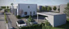 - Der Eingangsbereich, die Carports und die Abtrennung zwischen den Terrassen werden in Beton ausgeführt
