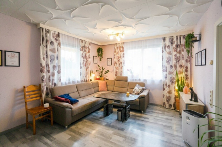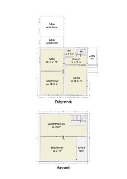 Im Erdgeschoß befinden sich Windfang, Vorraum, separates WC, Wohn- und Schlafzimmer sowie eine Küche mit Einbaugeräten. Dahinter wurden ein Badezimmer mit bodengleicher Dusche und ein Abstellraum angebaut. Das Dachgeschoß bietet ein großzügiges Mansardenzimmer und ein weiteres Zimmer mit begehbarer Garderobe.