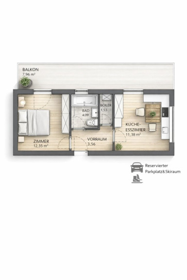 Die Einheit präsentiert sich in gepflegtem Zustand und ist vollständig möbliert. Ein reservierter Stellplatz steht zur Verfügung, ebenso ein Skiraum im Haus. WLAN-Anschluss ist vorhanden.