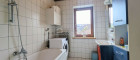 Das Badezimmer präsentiert sich dank des großen Fensters besonders hell und einladend. Es ist mit einer komfortablen Badewanne und einem Waschbecken ausgestattet; zudem befindet sich hier der Waschmaschinenanschluss.