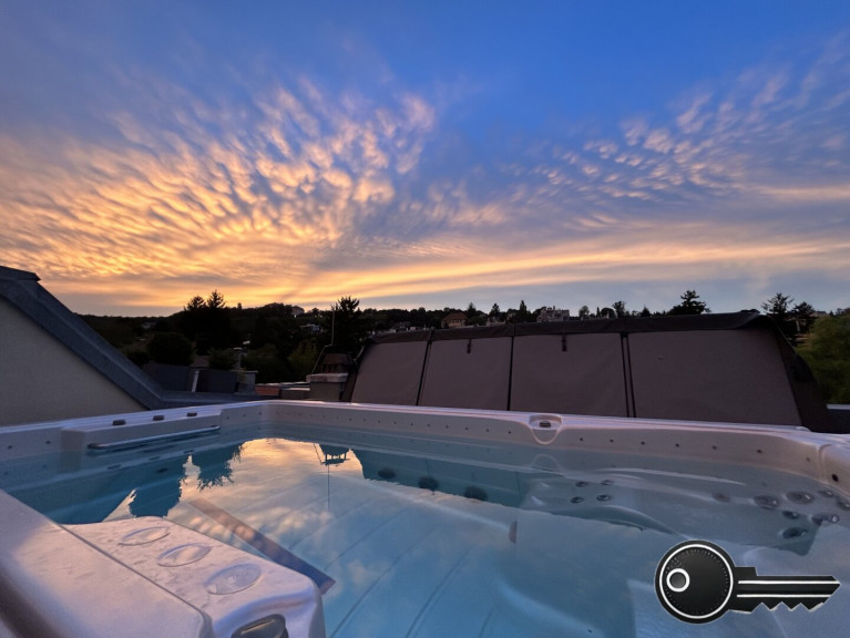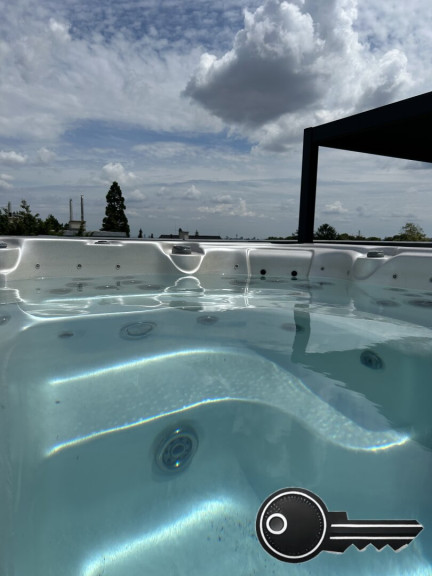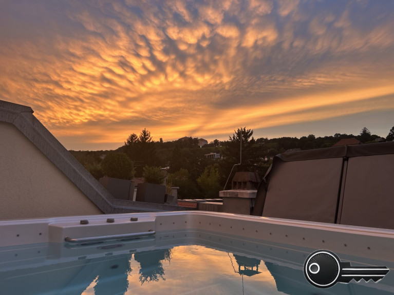 Eine absolute Rarität ist der auf der eigenen Dachterrasse installierte Swimspa (Whirlpool mit Gegenstromanlage). Hier können Sie also mit Blick auf das Schloss Wilhelminenberg in die Abendsonne schwimmen (!) oder vom Wasser aus mit Freunden auf dem Outdoor-TV ein Sportevent ansehen. Sie müssen also nicht mehr alles zusammenpacken und ins Freibad fahren!