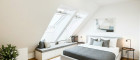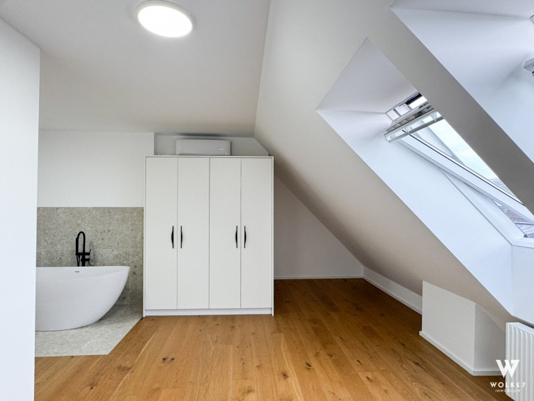 Das obere Geschoss bietet zwei Schlafzimmer, wovon eines mit einer freistehenden Badewanne direkt im Raum für ein außergewöhnliches Wohngefühl sorgt. Ein modernes Badezimmer mit Fenster, Dusche, WC und Fußbodenheizung rundet das Raumkonzept ab.