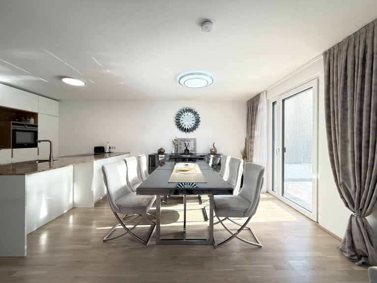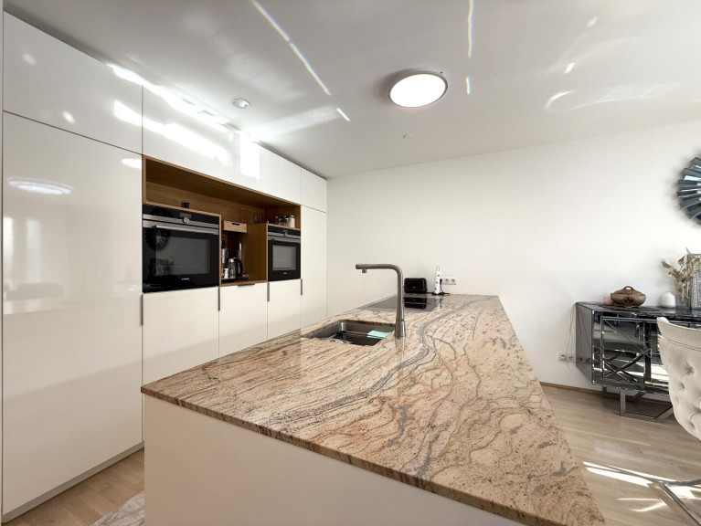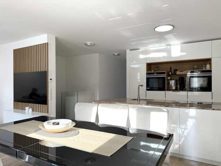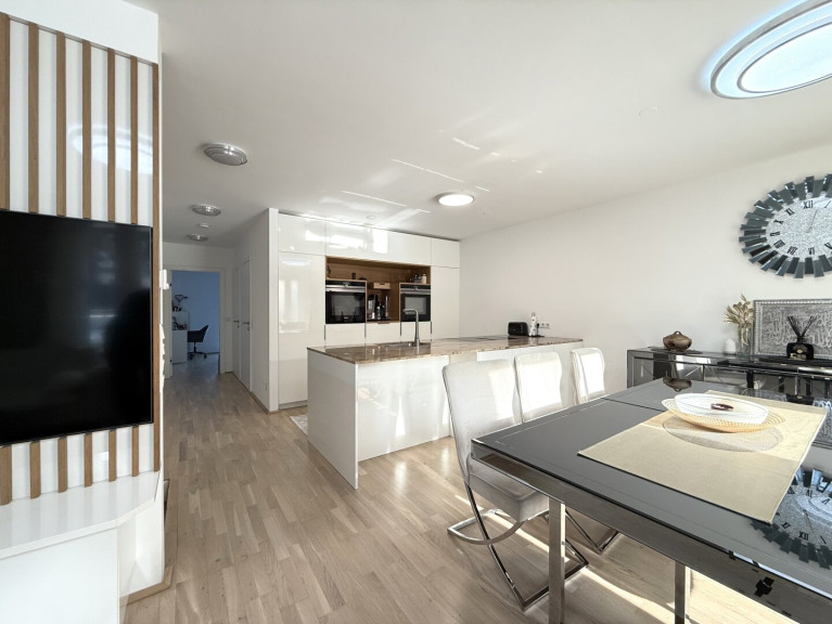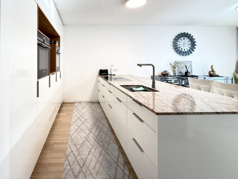 Das Herzstück der Wohnung ist zweifellos der 39 m² große Wohn-Essbereich, lichtdurchflutet, großzügig und mit direktem Zugang zur Terrasse. Die offene Küche mit Insel und versteckter Speisekammer ist nicht nur funktional, sondern ein echtes Designhighlight.