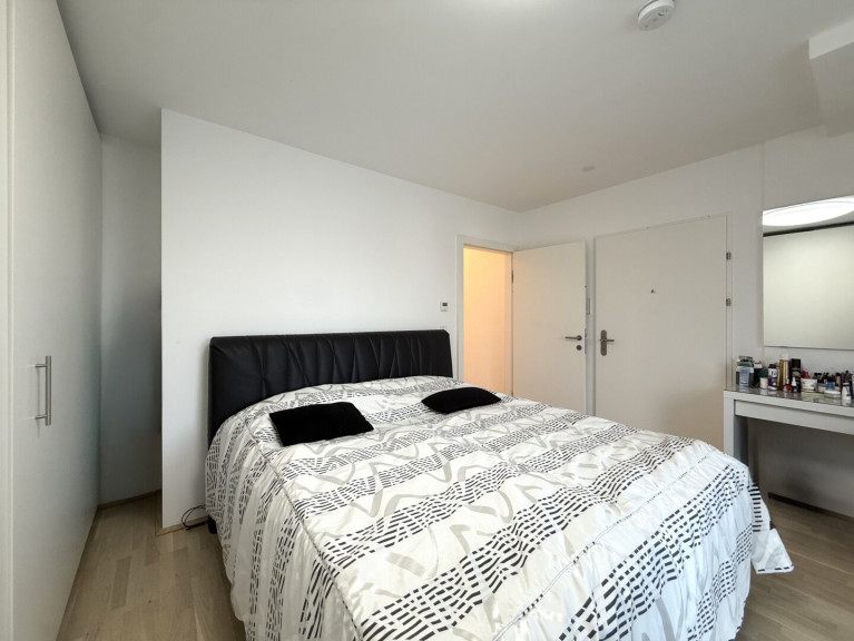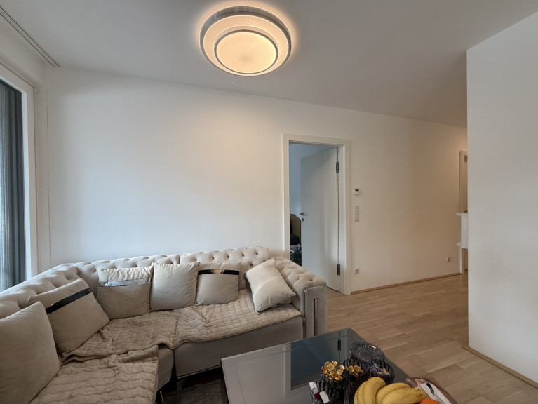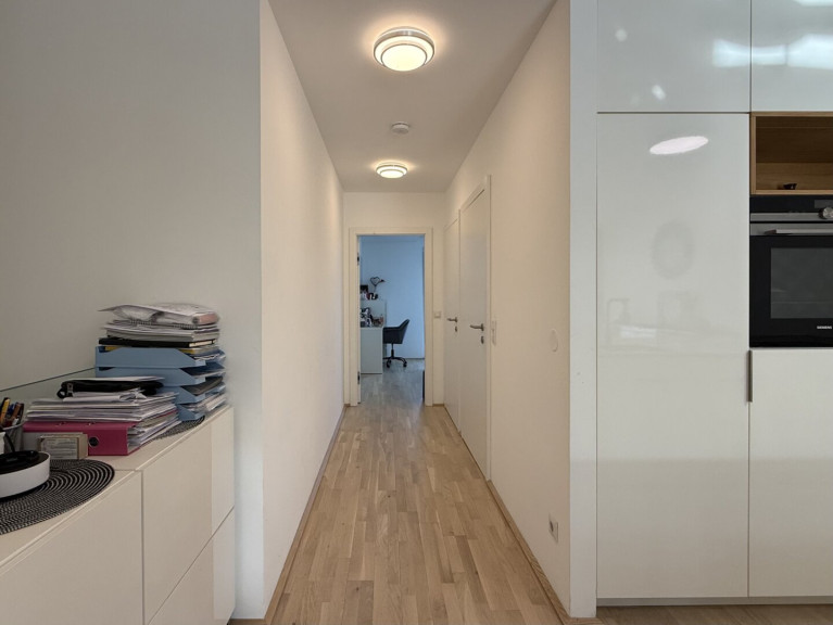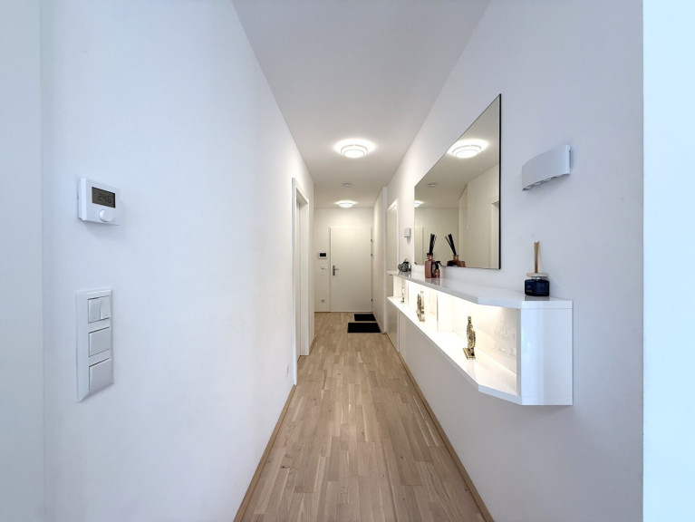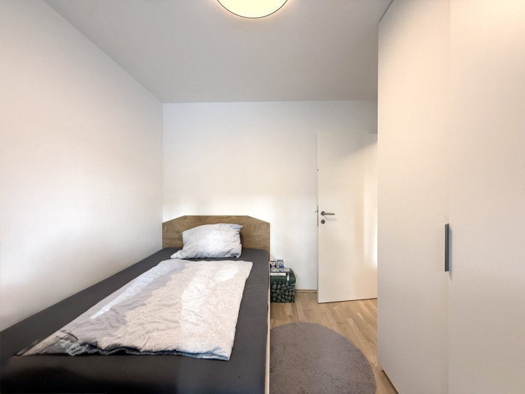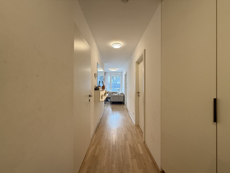 Diese Wohnung empfängt Sie mit einem eleganten Vorraum, maßgefertigten Einbaumöbeln und einem durchdachten Grundriss. Zwei kompakte Zimmer (ca. 9 und 10 m²) eignen sich ideal als Kinderzimmer, Homeoffice oder Rückzugsraum. Ein erstes hochwertig ausgestattetes Bad mit Walk-In-Dusche und WC liegt ebenfalls gleich im Eingangsbereich.