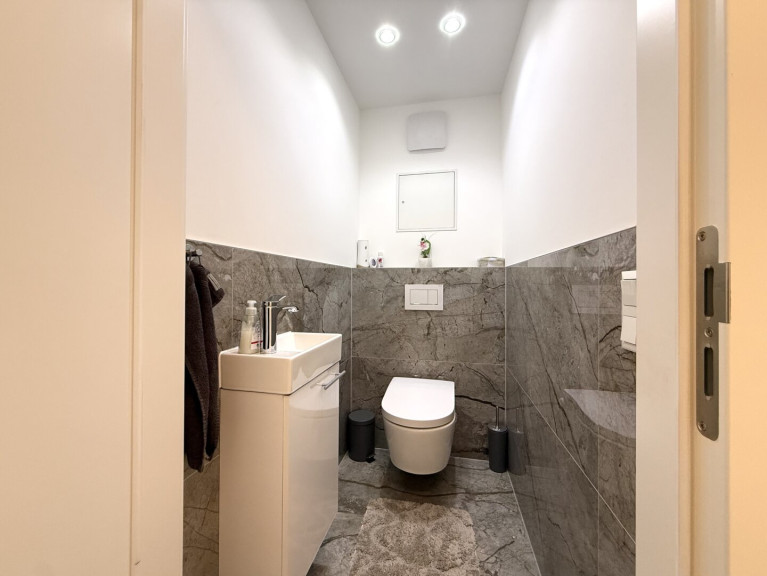 Der separate Gästebereich mit eigenem Zugang im Souterrain bietet ca. 33 m² zusätzliche Fläche, bestehend aus einem großen Raum und einem eigenen Badezimmer mit WC. Perfekt für Gäste, Au-pair, Homeoffice oder ruhige Hobbys – vollwertig nutzbar und völlig unabhängig vom Hauptraumkonzept. Belichtet wird dieses durch eine Oberlichte im vorgelagerten Lichthof - so hat man selbst im Souterrain tagsüber ein bisschen Tageslicht.