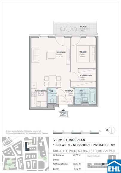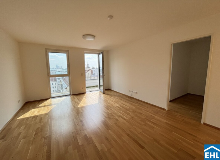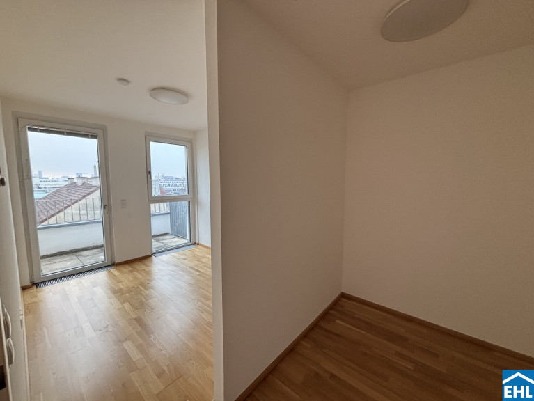 Die Wohnung befindet sich in im 1. Dachgeschoss und gliedert sich in einen großzügigen Wohnraum mit Kochnische, ein Schlafzimmer mit eigenem Schrankraum, ein Badezimmer mit Badewanne und Waschmaschinenanschluss, einem separaten WC sowie einen Vorraum. Der vom Wohn- und Schlafzimmer begehbare, rund 6m² große Balkon rundet diesen Wohntraum perfekt ab.