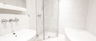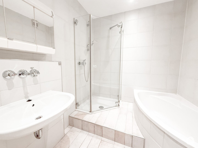 +) Bad: Boden- und Wandverfliesung; Waschbecken, Spiegelschrank, Badewanne, Dusche, Sprossen-Heizkörper