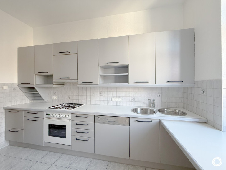 +) Küche: Isolierglasfenster; Gasherd, Backrohr, Dunstabzug, Spüle, Geschirrspüler, diverse Ober- und Unterkästen, Waschmaschinen-Anschluss