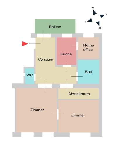 2 Zimmer, 1 Küche, 1 Home-Office-Bereich, 1 Vorraum, 1 Bad, 1 WC, 1 Balkon, 1 Abstellraum, 1 Kellerabteil