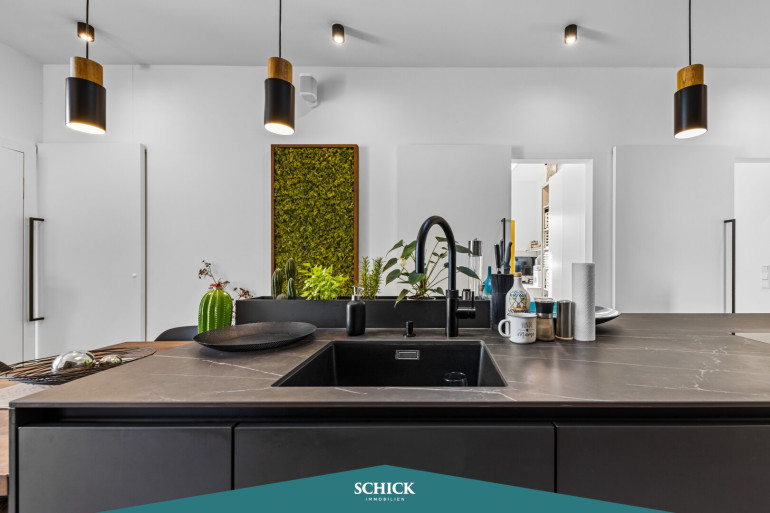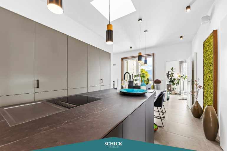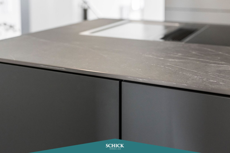Über einen Personenaufzug kommen Sie bequem direkt in Ihrer Penthaus-Wohnung an. Hier vereinen sich Eleganz und Funktionalität auf über 100 m². Stellen Sie sich vor, Sie betreten Ihre großzügige, lichtdurchflutete Penthaus-Wohnung mit insgesamt 70 m² Terrassenfläche. Hohe Decken – Raumhöhe 2,80 m (!) – verbreiten ein luftiges Wohngefühl. Gleich zwei Terrassen ermöglichen einen wunderbaren Blick. Freuen Sie sich über das offene Wohnkonzept und Ihrer fast 50 m² große Wohnküche. Die qualitätsvolle Einbauküche sorgt für ein unvergleichliches Kocherlebnis. Nicht nur Hobbyköche wissen die kratz- und schnittfeste Arbeitsplatte aus Keramik und das Wassersystem von QUOOKER zu schätzen.