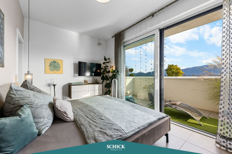 ++ Schlafzimmer mit Zugang zur zweiten Terrasse und Blick auf die Bergkulisse,