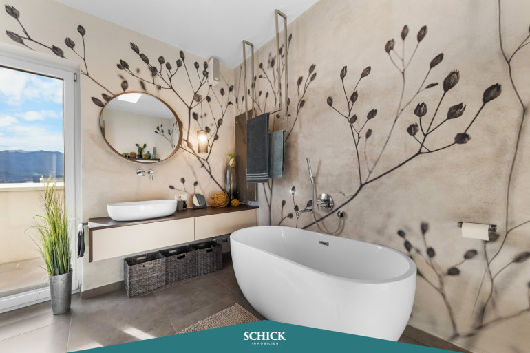Perfekt geeignet für ein „Sitzfenster“ ist der Übergang zwischen Wohn- und Essbereich. Treten Sie ein in ein Schlafzimmer, wo Eleganz und Komfort Hand in Hand gehen. Der Zugang zur zweiten 33 m² großen Terrasse und das luxuriöse En-Suite Badezimmer verleihen Ihrem Schlafzimmer das gewisse Extra! Hier verzaubern Sie die teil-freistehende Badewanne, stilvolle Designelemente und die Walk-in-Dusche.