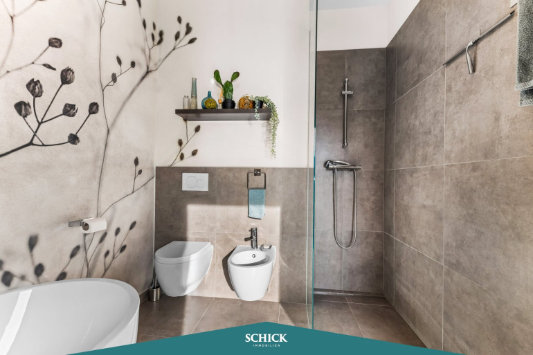 Badezimmer mit bodengleicher Dusche und qualitätsvoller Ausstattung