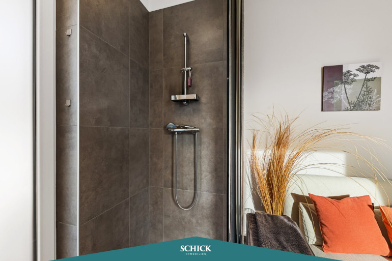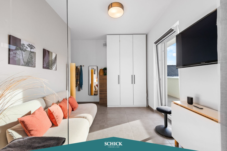 Noch mehr Platz bietet der ans Schlafzimmer angeschlossene Schrankraum im durchdachten Design. Direkt daneben befindet sich der Abstellraum, der auch als kleines Büro oder Homeoffice genutzt werden kann. Ein zweites gut 10m² großes Zimmer punktet mit direktem Zugang zur Terrasse, En-Suite-Badezimmer und qualitätsvoller Ausstattung.