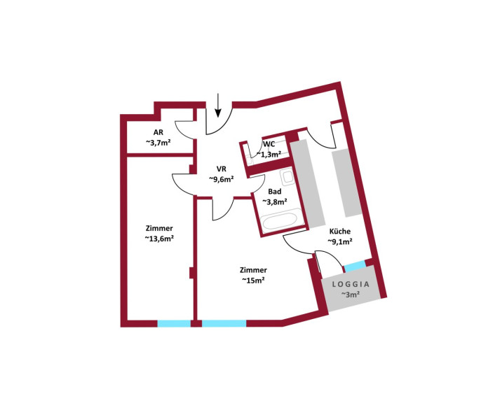 Die Wohnung bietet eine klare Raumaufteilung: vom Vorzimmer aus erreicht man den Abstellraum, das Bad, das separat gelegene WC sowie die Küche. Von dort gelangt man direkt auf die Loggia, ideal um warme Abende entspannt ausklingen zu lassen.