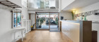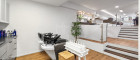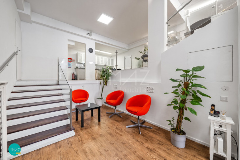 Auf Straßen- und Zwischengeschossebene bieten diese hellen, offenen Räumlichkeiten derzeit einen großzügigen Eingangs-/Rezeptions- und Wartebereich, eine Küche mit Abstellraum und Aufenthaltsmöglichkeit sowie das vielfältig nutzbare Obergeschoss mit Glasfront und Blick auf die Lerchenfelder Straße.