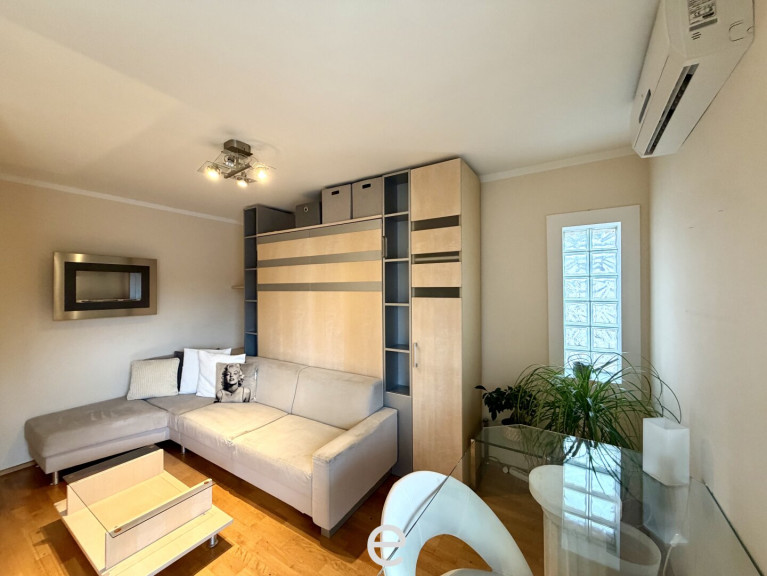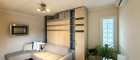 In allen Obergeschossräumen wurde ein hochwertiges Einbaumöbel integriert, das tagsüber als eleganter Wohnbereich genutzt wird. Das Bett ist in einen maßgefertigten Schrank integriert und kann bei Bedarf einfach heruntergeklappt werden. Vor dem geschlossenen Schrank befindet sich eine Couch, sodass der Raum tagsüber als Wohnzimmer oder Lounge fungiert und abends mit wenigen Handgriffen in ein vollwertiges Schlafzimmer umgewandelt wird.