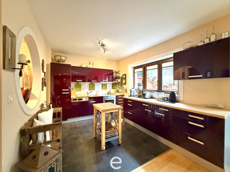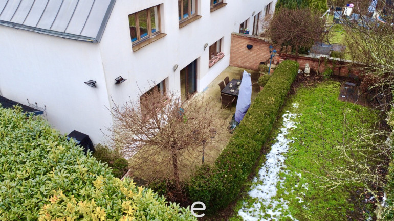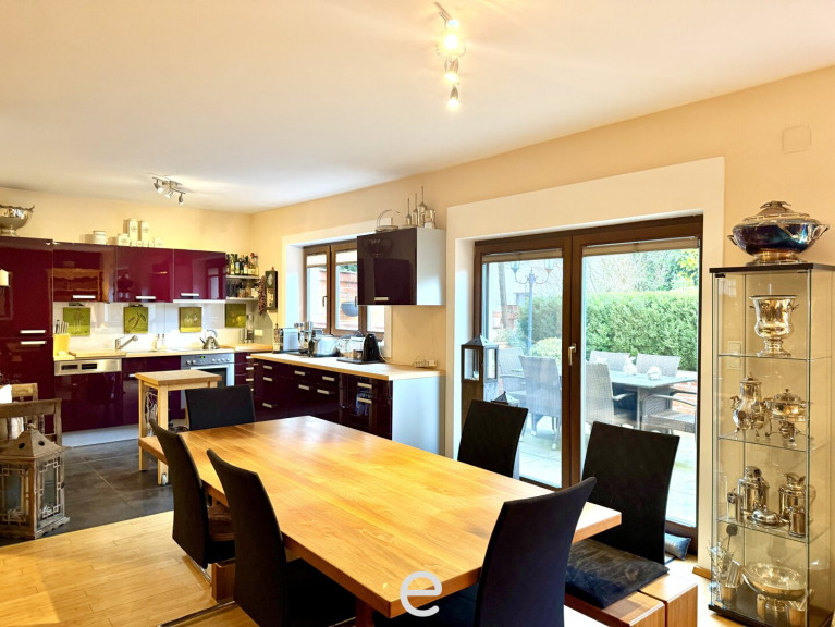 Bereits beim Eintreten empfängt Sie das Erdgeschoss mit einer offenen und einladenden Wohnatmosphäre. Herzstück dieser Ebene ist die großzügige, offen gestaltete Küche, die harmonisch in den Wohn- und Essbereich übergeht. Für zusätzlichen Komfort sorgt die im gesamten Erdgeschoss verbaute Fußbodenheizung. Die durchdachte Gestaltung schafft ein luftiges Raumgefühl und bietet viel Platz für gemeinsames Kochen, gesellige Abende oder entspannte Stunden im Kreise der Familie. Großzügige Fensterflächen sorgen für angenehme Helligkeit und führen direkt hinaus auf die rd. 27 m² Terrasse und in den wunderschön begrünten, liebevoll gepflegten Garten. Innen- und Außenbereich gehen hier fließend ineinander über und verleihen dem Haus ein besonders angenehmes Wohngefühl mit hoher Lebensqualität.