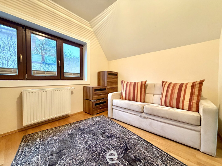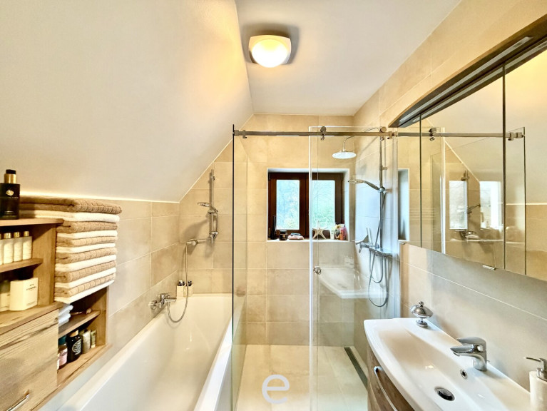 Im ersten Obergeschoss befinden sich drei gut geschnittene Zimmer sowie ein Badezimmer und ein separates WC. Das angrenzende Badezimmer überzeugt mit Badewanne, begehbarer Dusche, Waschbecken und Handtuchheizkörper. Die aktuelle Aufteilung eignet sich ideal für Familien mit Kindern, da mehrere Schlaf- oder Arbeitszimmer vorhanden sind und ausreichend Rückzugsmöglichkeiten bieten. Gleichzeitig eröffnet die bauliche Struktur zusätzliche Gestaltungsmöglichkeiten: Da einzelne Innenwände nicht tragend sind, lässt sich die Raumaufteilung bei Bedarf an individuelle Wohnbedürfnisse anpassen. So können beispielsweise zwei Zimmer zu einem großzügigen Master Bedroom mit Ensuite-Bad zusammengelegt oder offene Arbeitsbereiche geschaffen werden. Damit ist das Haus nicht nur für klassische Familienkonzepte attraktiv, sondern auch für Paare mit Wunsch nach mehr Raum oder kombinierter Wohn- und Arbeitslösung.