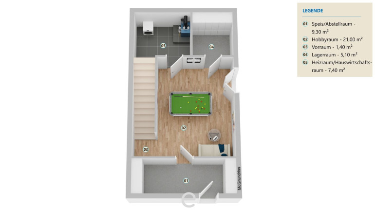 Das Kellergeschoss bietet zusätzlichen Stauraum sowie vielseitig nutzbare Räume, beispielsweise als Hobby-, Fitness- oder Lagerraum, wie es auch vom derzeitigen Eigentümer genutzt wurde. Technik- und Versorgungsräume sind ebenfalls hier untergebracht.