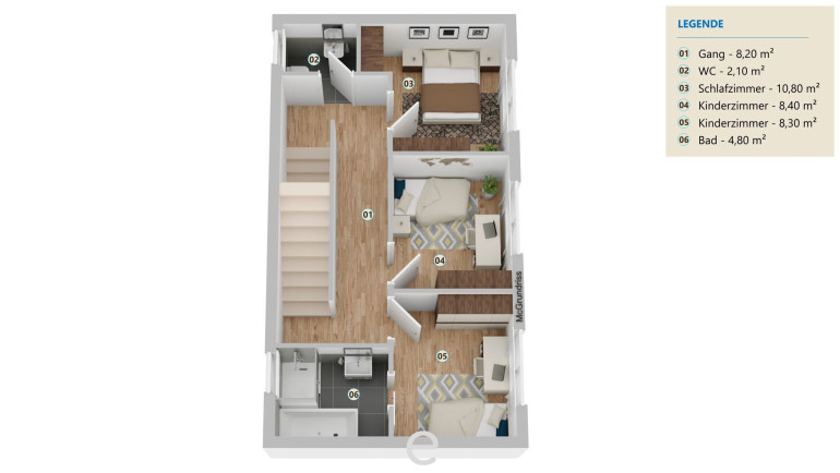 Im ersten Obergeschoss befinden sich drei gut geschnittene Zimmer sowie ein Badezimmer und ein separates WC. Das angrenzende Badezimmer überzeugt mit Badewanne, begehbarer Dusche, Waschbecken und Handtuchheizkörper. Die aktuelle Aufteilung eignet sich ideal für Familien mit Kindern, da mehrere Schlaf- oder Arbeitszimmer vorhanden sind und ausreichend Rückzugsmöglichkeiten bieten. Gleichzeitig eröffnet die bauliche Struktur zusätzliche Gestaltungsmöglichkeiten: Da einzelne Innenwände nicht tragend sind, lässt sich die Raumaufteilung bei Bedarf an individuelle Wohnbedürfnisse anpassen. So können beispielsweise zwei Zimmer zu einem großzügigen Master Bedroom mit Ensuite-Bad zusammengelegt oder offene Arbeitsbereiche geschaffen werden. Damit ist das Haus nicht nur für klassische Familienkonzepte attraktiv, sondern auch für Paare mit Wunsch nach mehr Raum oder kombinierter Wohn- und Arbeitslösung.
