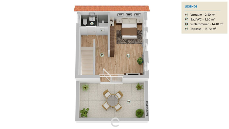 Das Dachgeschoss bildet einen besonderen Rückzugsort. Hier befindet sich ein weiteres Zimmer mit Zugang zur rd. 15,68 m² Dachterrasse, welche 2021 umfassend saniert wurde, sowie ein eigenes Badezimmer. Dieser Bereich eignet sich hervorragend als Atelier, Homeoffice oder als separater Schlafbereich und ist mit einer Klimaanlage sowie einem innenliegenden Sonnenschutz ausgestattet. Die erhöhte Lage und die Dachterrasse schaffen ein besonderes Wohngefühl mit Weitblick.