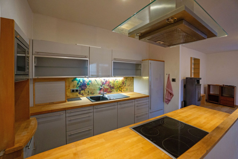 Dielenboden, Parkett, Zentralheizung, Einbauküche, Wohnküche / offene Küche, Bad mit Fenster, Badewanne, Dusche, Garage