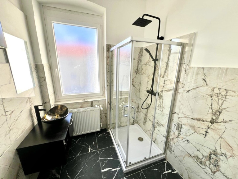 Die Wohnung wurde kürzlich modernisiert und überrascht mit einem harmonischen Zusammenspiel aus stilvollen Fliesen und warmem Laminat. Die Einbauküche ist nicht nur funktional, sondern ein echter Blickfang, der das Kochen zum Vergnügen macht. Die praktische Dusche sorgt für eine entspannte Atmosphäre und rundet das durchdachte Raumkonzept ab.