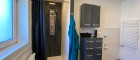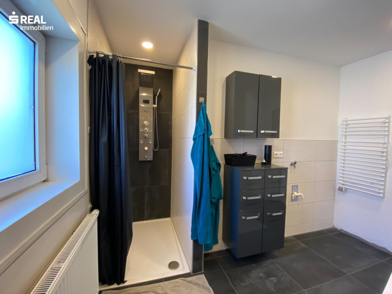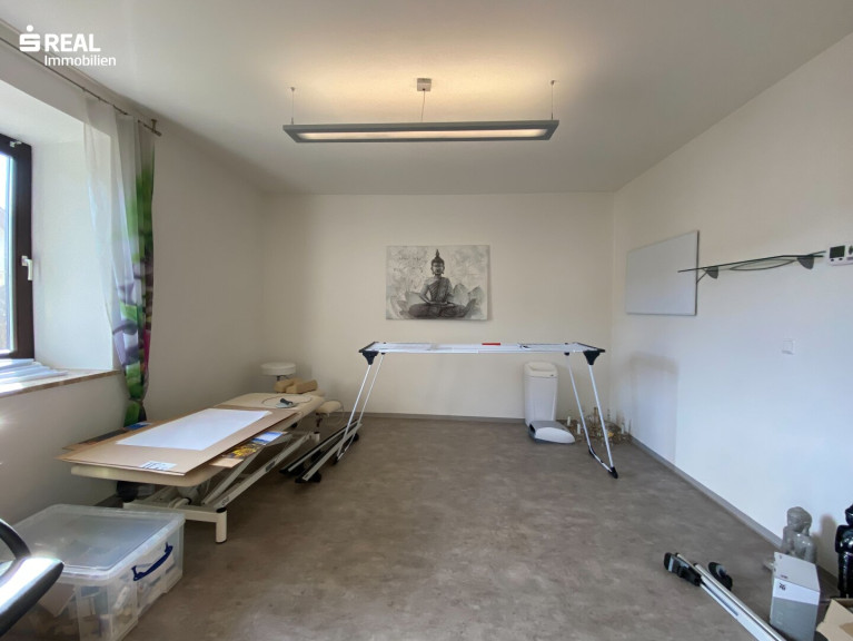 Im Erdgeschoß hat der jetzige Eigentümer eine Büro/Praxis-Einheit eingerichtet, die komplett abgetrennt vom Wohnbereich ist (natürlich ist es aber leicht wieder zurückzubauen). Zudem gibt es im EG eine kleine Dusche, ein WC, eine schöne große Küche mit angrenzendem Wohn/Essbereich mit gemütlichem Kachelofen und den Ausgang in den Innenhof der Liegenschaft.