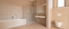 Das Schlafzimmer verfügt über ein eigenes, direkt angrenzendes Badezimmer samt Badewanne, Regendusche, Doppelwaschbecken sowie Toilette - ein Saunaanschluss ist ebenfalls vorhanden. Ein zeitloses und ansprechendes Design verleiht diesen Räumlichkeiten einen besonderen Charme.