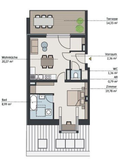 52,95 m2 Wohnfläche zzgl. 14,33 m2 Terrasse,