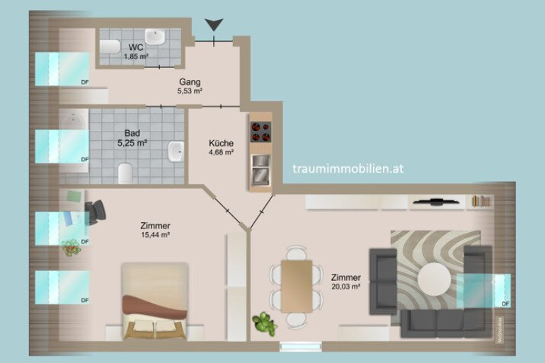 * Raumaufteilung: Gang, WC, Küche, Badezimmer, 2 Zimmer