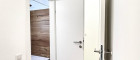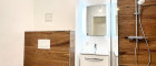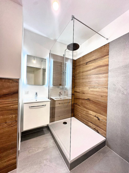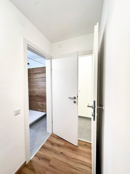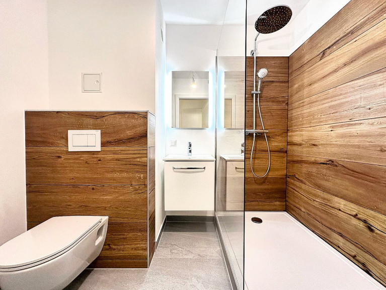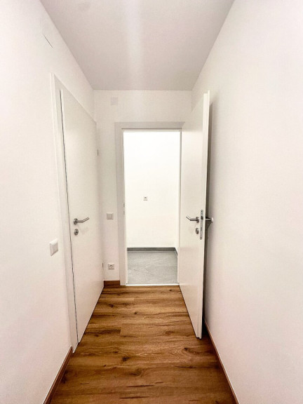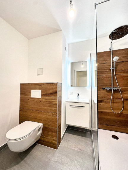 Bereits der Vorraum bietet genau die richtige Größe und schafft einen angenehmen Empfangsbereich mit ausreichend Platz für Garderobe. Das modern gestaltete Badezimmer mit Dusche und Toilette besticht durch die harmonische Kombination aus edlem Holzoptik- und stilvollem grauen Feinsteinzeug. Ein Spiegel mit Waschbecken rundet das hochwertige Erscheinungsbild ab. Der praktische Abstellraum sorgt zusätzlich für Ordnung und Stauraum.