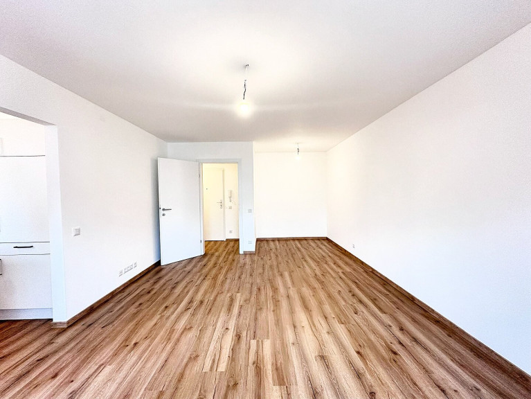 Der großzügige Wohn-, Ess- und Schlafbereich eröffnet vielfältige Gestaltungsmöglichkeiten: Ob gemütliches Bett in der Nische, Sofa- und Essbereich, ausziehbares Wohnsofa mit Leseecke oder sogar ein begehbarer Schrank – hier lässt sich der Wohnraum individuell nach eigenen Bedürfnissen gestalten. Hochwertiger Vinylboden in täuschend echter Holzoptik verleiht der gesamten Wohnung eine warme, behagliche Atmosphäre.