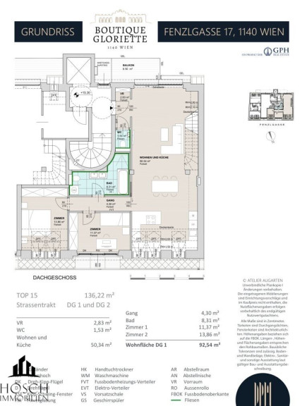Die Dachgeschoss-Maisonette Top 15 erstreckt sich über zwei Ebenen und verfügt über eine Wohnfläche von ca. 136,22 m². Die durchdachte Raumaufteilung sowie die attraktiven Außenflächen machen diese Einheit zu einer idealen Kombination aus Stadtresidenz und hochwertigem Familienwohnsitz.