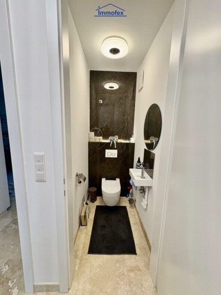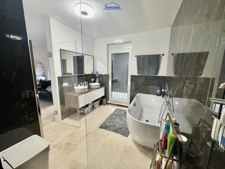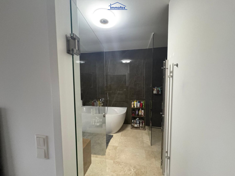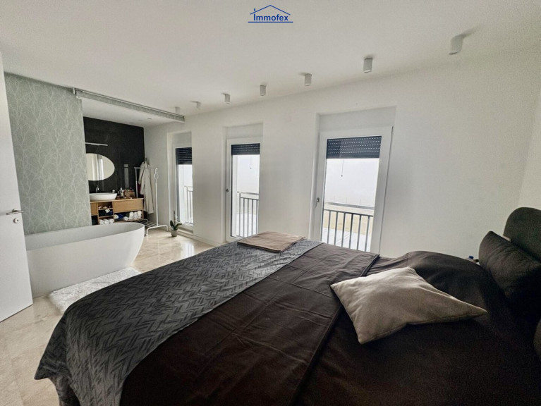 Rückzug und Maßarbeit im Obergeschoss Über die Treppe gelangen Sie in das helle Obergeschoss. Auch hier setzen sich die exklusiven Tischler-Maßmöbel fort, die optimalen Nutzen mit zeitlosem Design verbinden. Zwei lichtgeflutete Schlafzimmer bieten Platz für Träume, während zwei Badezimmer für entspannte Morgenstunden sorgen. Ein separater Schrankraum bringt die Struktur, die man braucht, um befreit durch den Tag zu gehen.