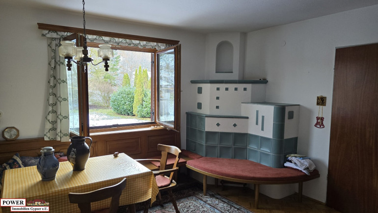 Ein Kachelofen befindet sich im Wohnraum, um die wohlige Wärme im Haus zu genießen und auch Heizkosten zu sparen.
